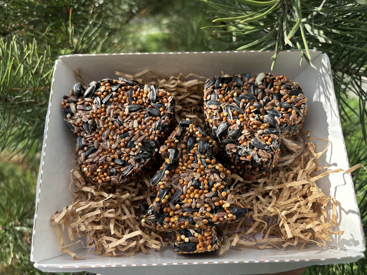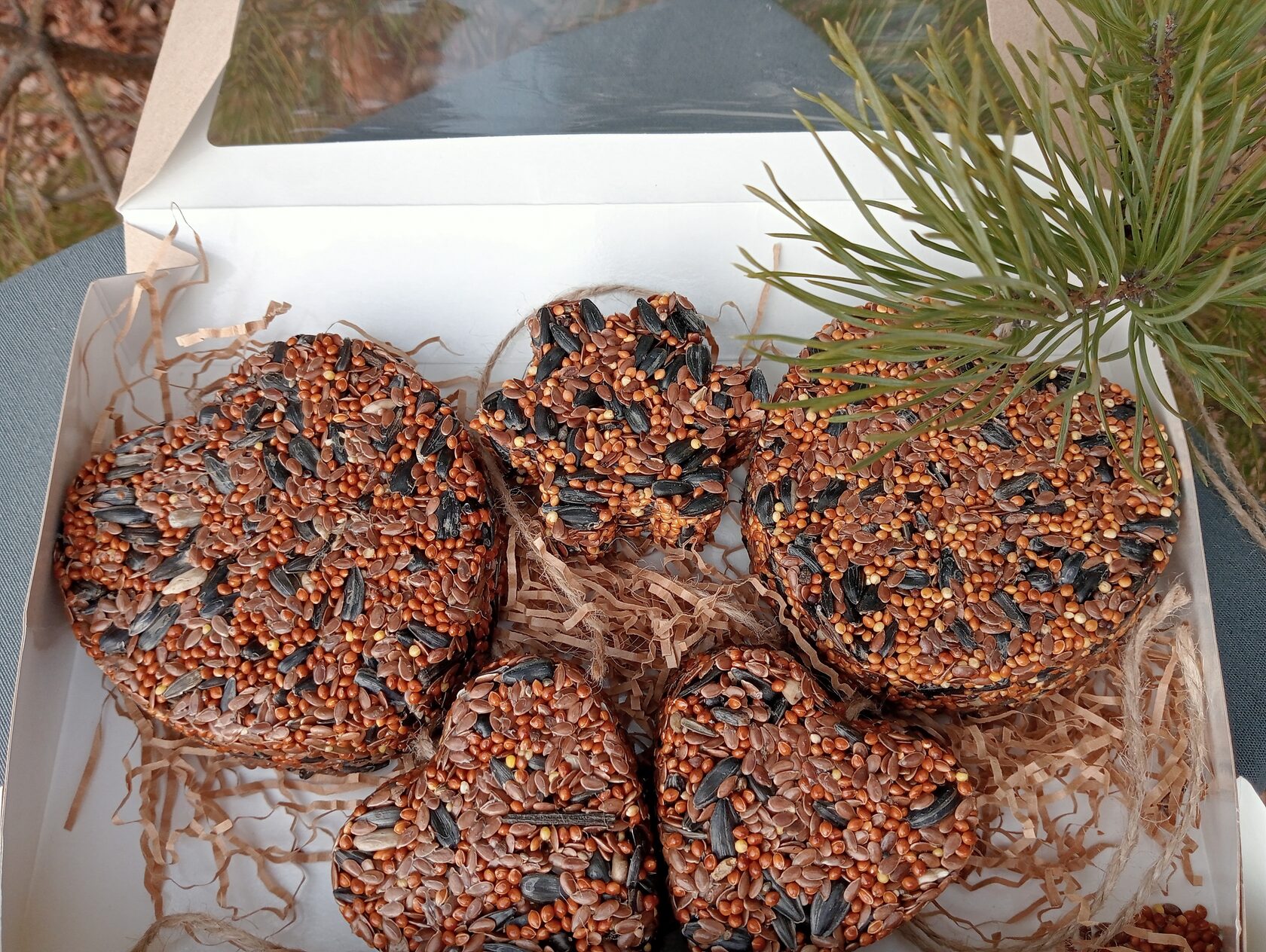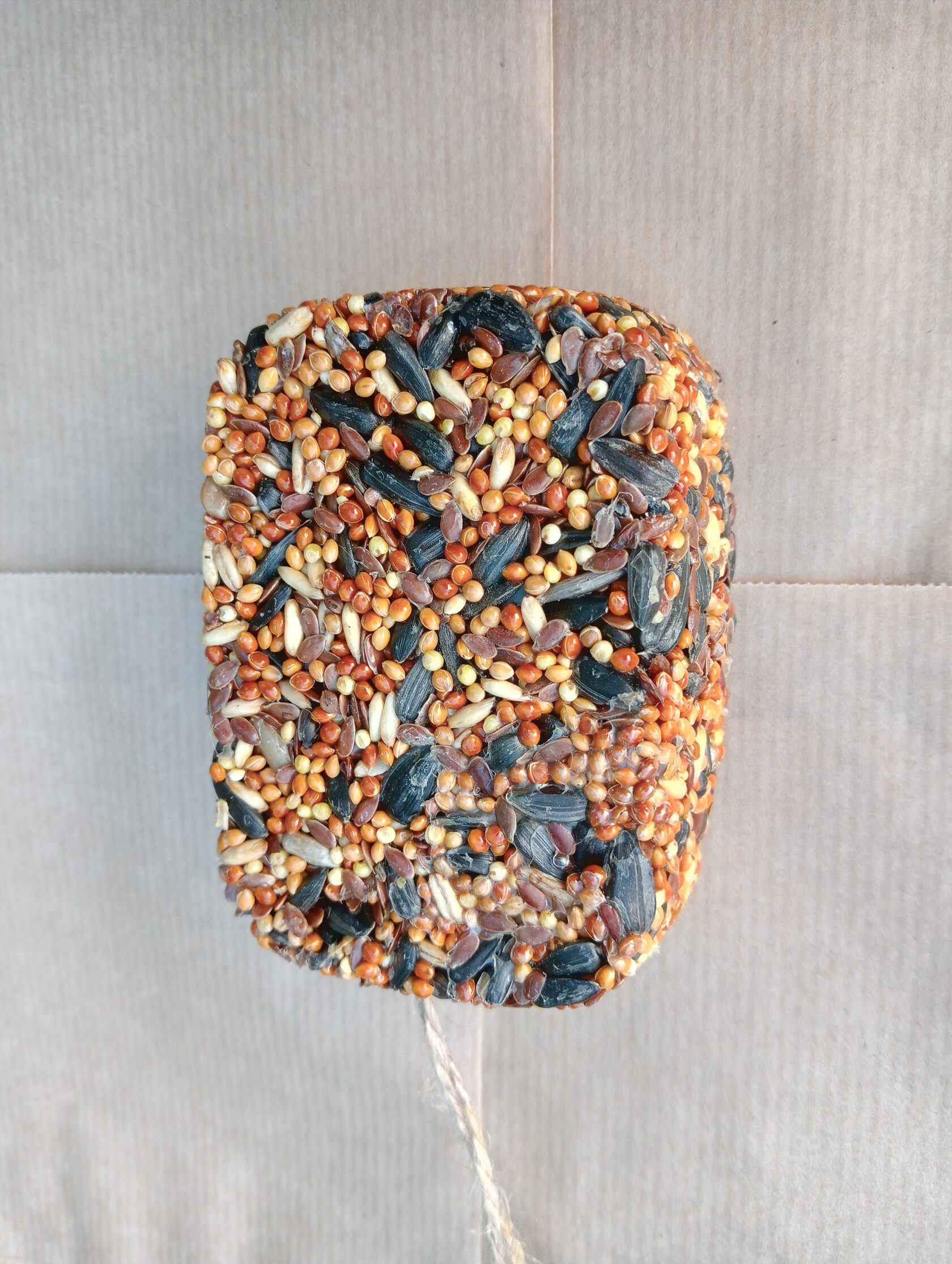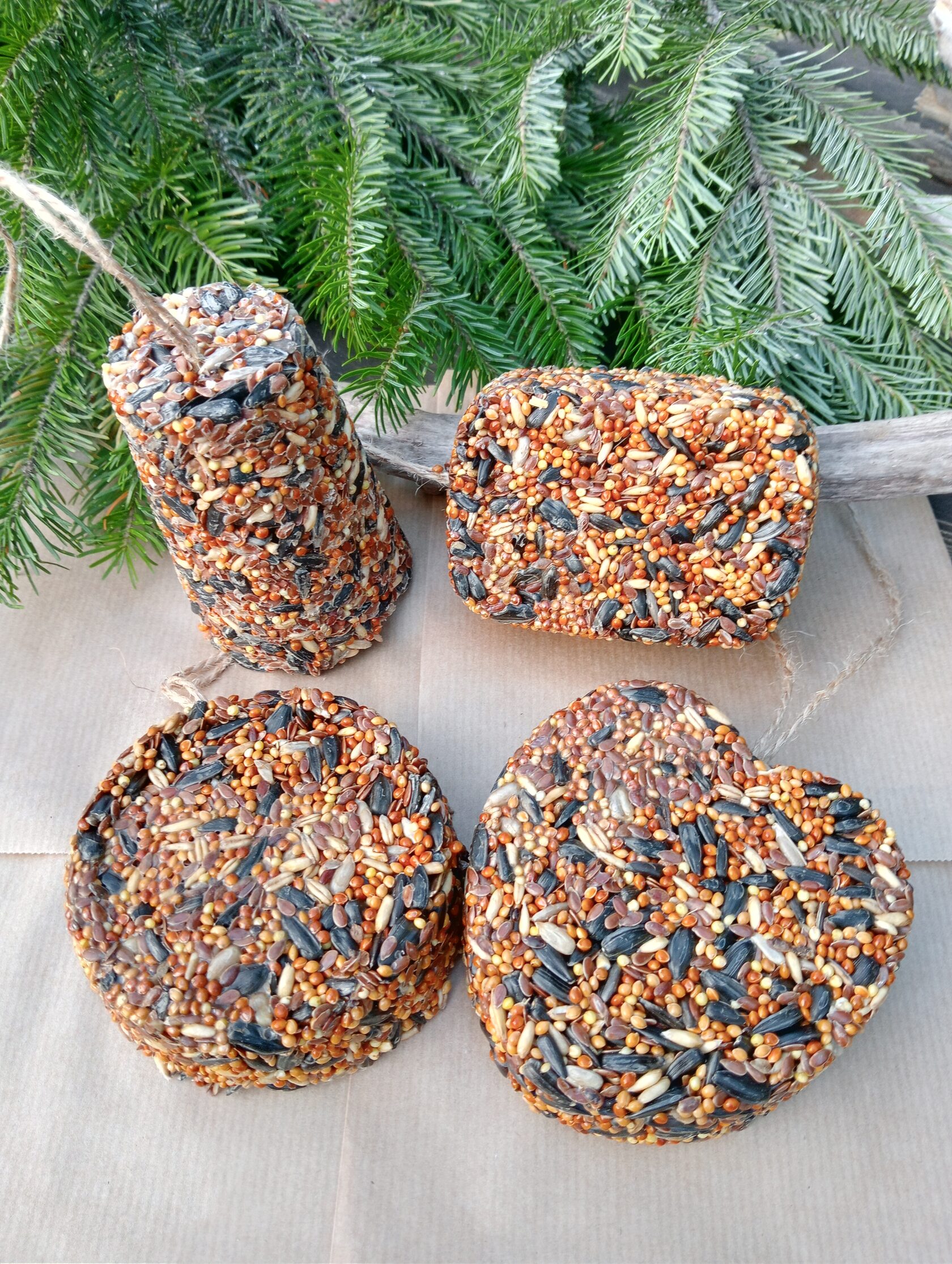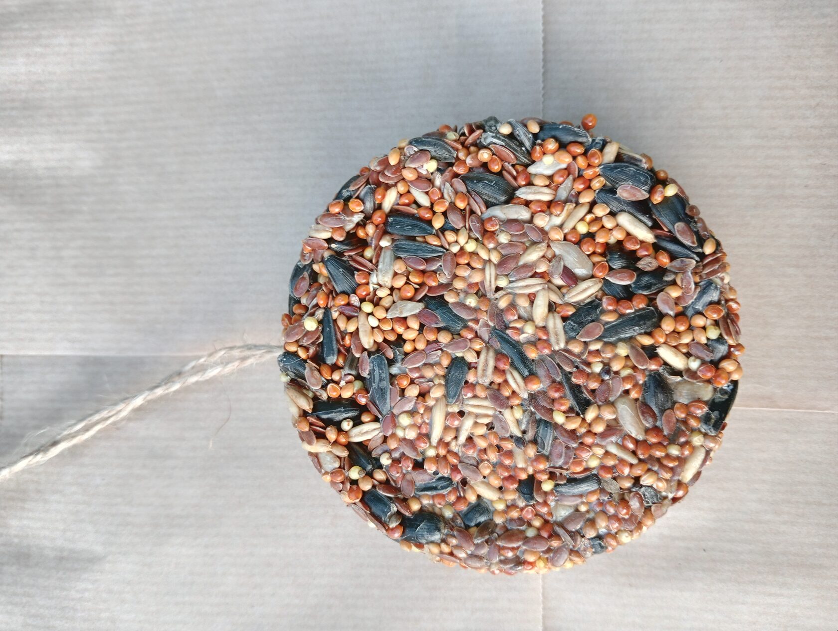 Мы производим зерновое печенье разных форм и размеров, состоящих из семян : проса желтого и красного, льна и семян подсолнечника. Каждая кормушка оснащена джутовой нитью для крепления к ветке дерева.