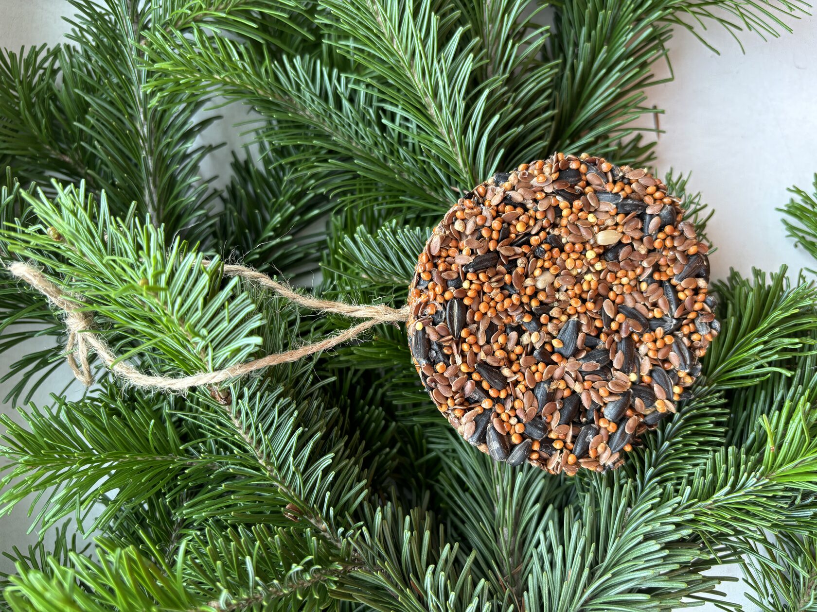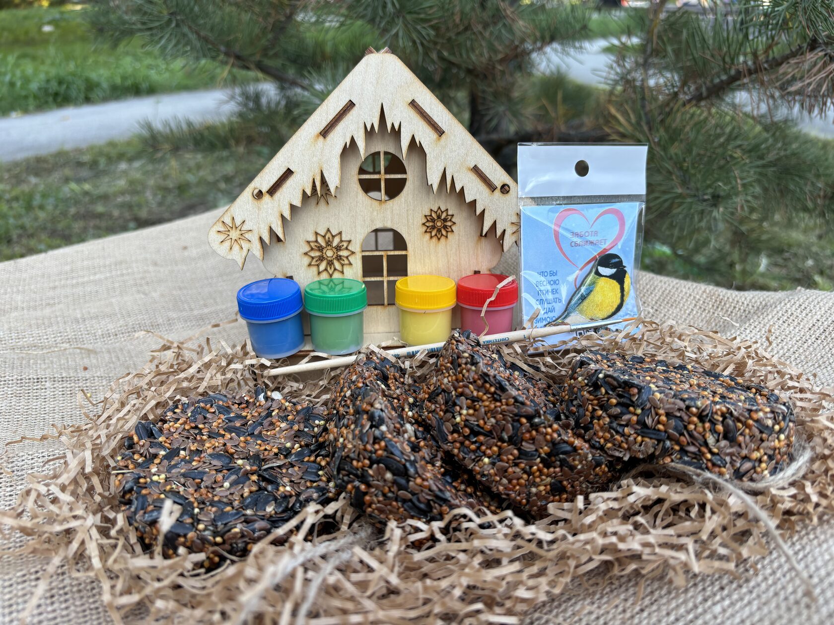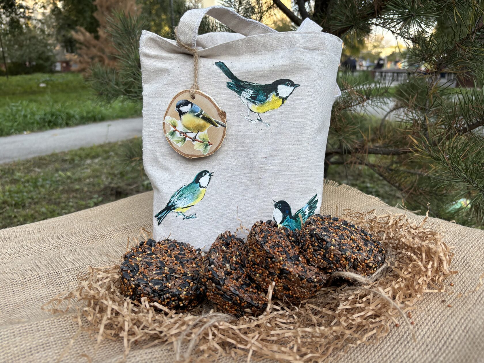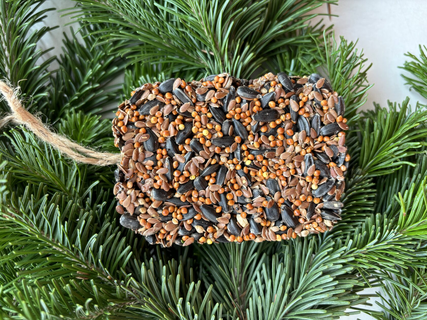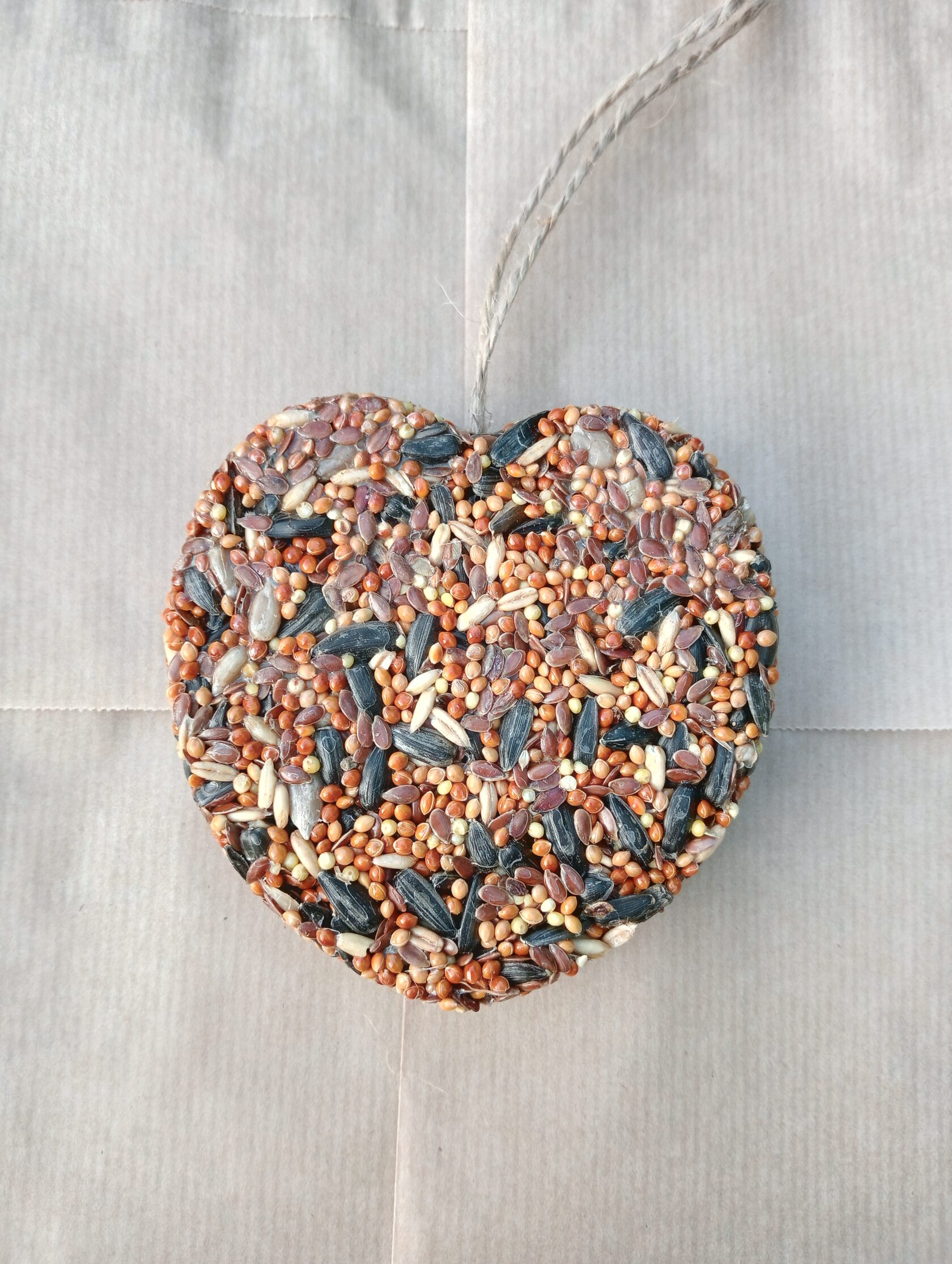 Мы производим зерновое печенье разных форм и размеров, состоящих из семян : проса желтого и красного, льна и семян подсолнечника. Каждая кормушка оснащена джутовой нитью для крепления к ветке дерева.